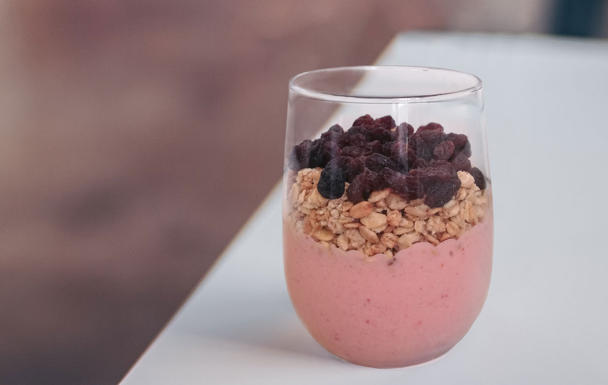 Add yoghurt, strawberries and bananas into a blender and blend until smooth. Pour into a glass or bowl and add muesli on top.