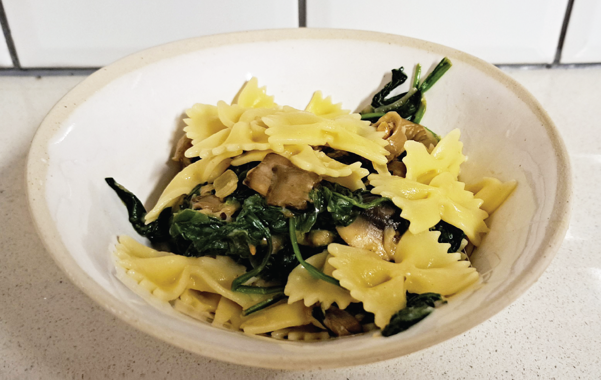 Drain pasta and add the mushroom spinach mix to the pasta. Add parmesan and Cheshire cheese and stir. Add cream cheese and stir thoroughly. Add salt and pepper to taste.