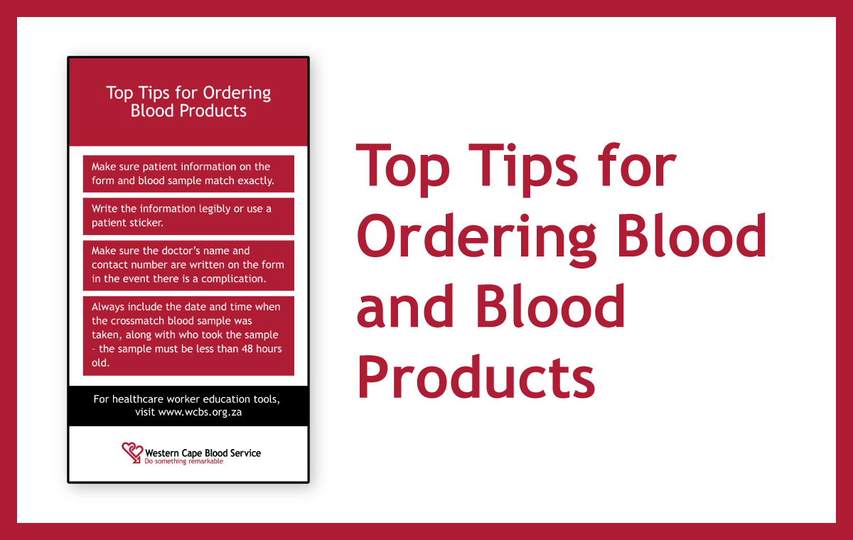 Welcome to this autumn edition where you can learn about top tips for ordering blood products, order your free hard copy of the newly published, 6th Edition of the Clinical Guidelines for the Use of Blood and Blood Products in South Africa (or download the digital version via our website), listen to our podcast explaining why we sometimes have to turn donors away, find out about the basic service level agreement between your hospital and WCBS, and get feedback about a nationwide blood drive that was held in April.